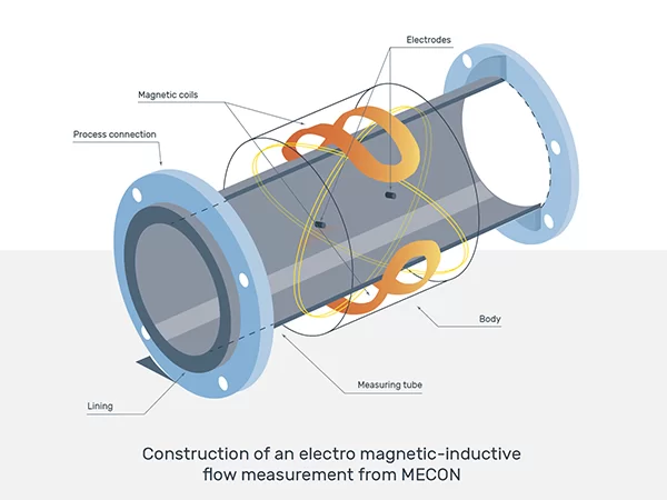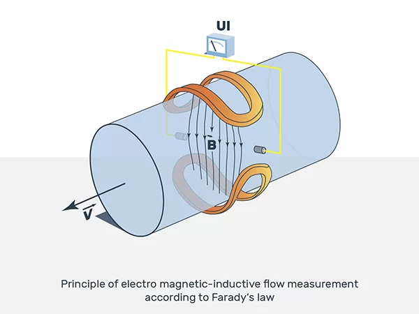 Đồng hồ đo lưu lượng dạng cảm biến điện từ (Magnetic-inductive flow meters) hoạt động dựa trên định luật Faraday và được dùng để đo dòng chảy của chất lỏng có tính dẫn điện như nước thải. Hai cuộn dây điện từ để tạo ra từ trường (B) đủ mạnh cắt ngang mặt ống dẫn chất lỏng. Theo định luật Faraday, khi chất lỏng chảy qua đường ống sẽ sinh ra một điện áp cảm ứng. Điện áp này được lấy ra bởi hai điện cực đặt ngang đường ống. Tốc độ của dòng chảy tỷ lệ trực tiếp với biên độ điện áp cảm ứng đo được.